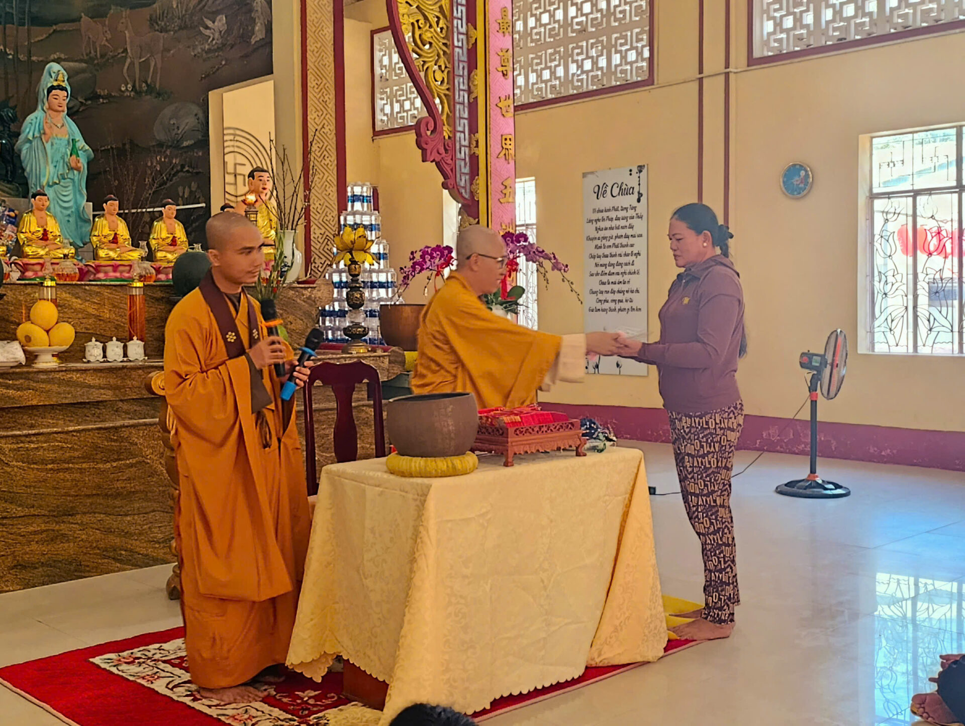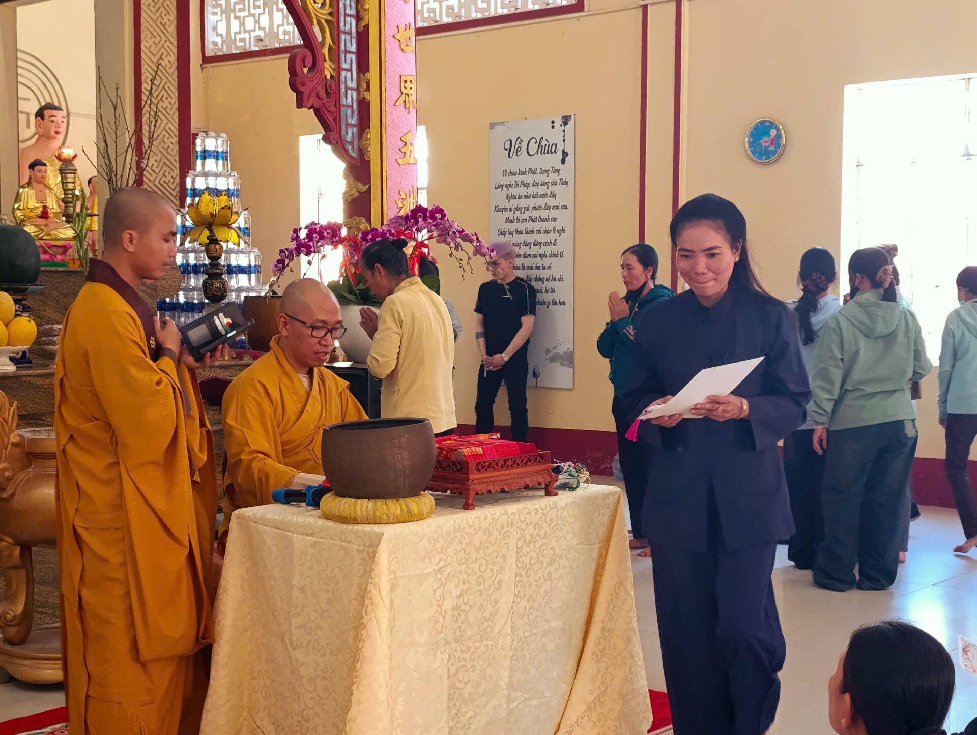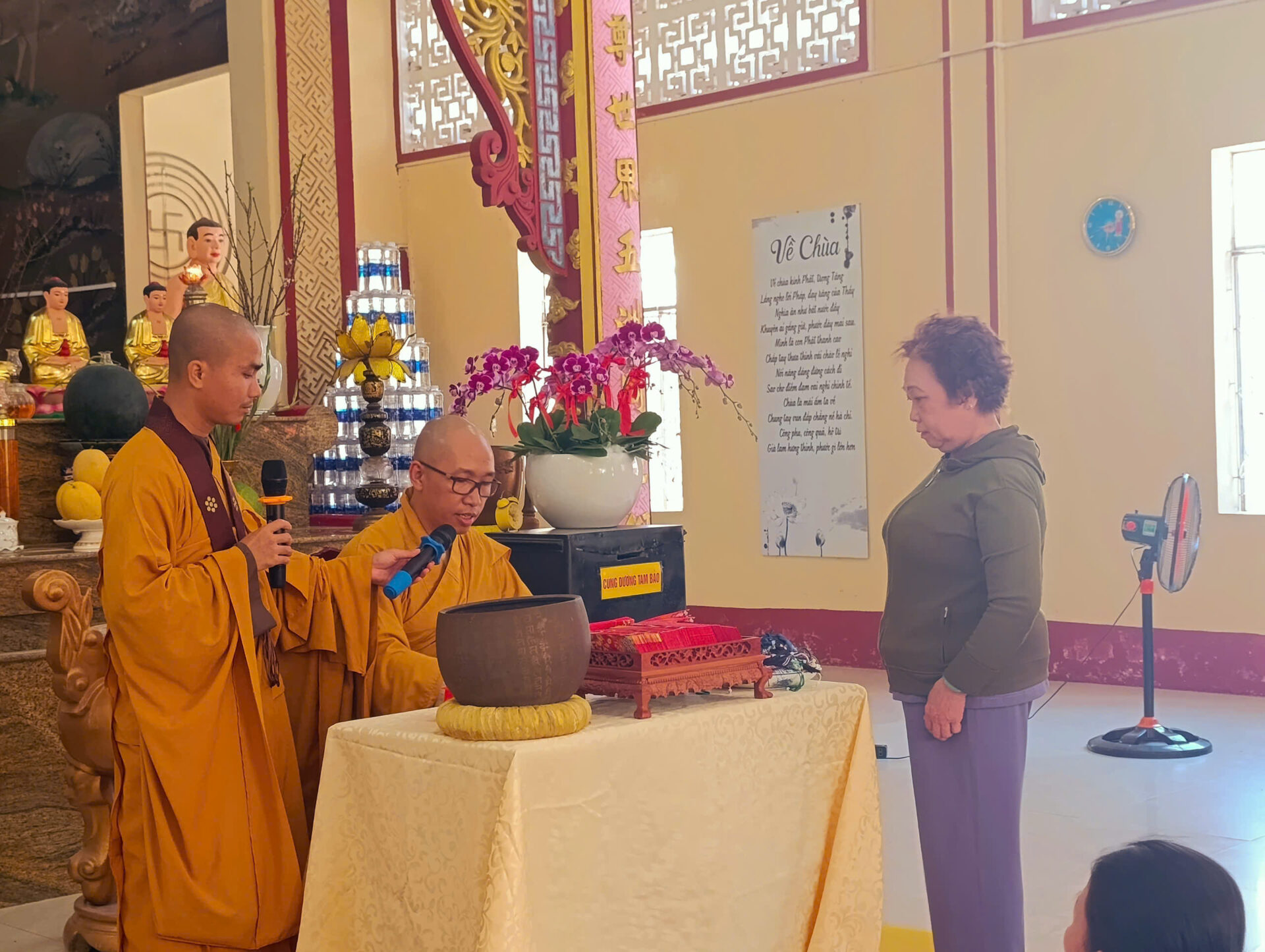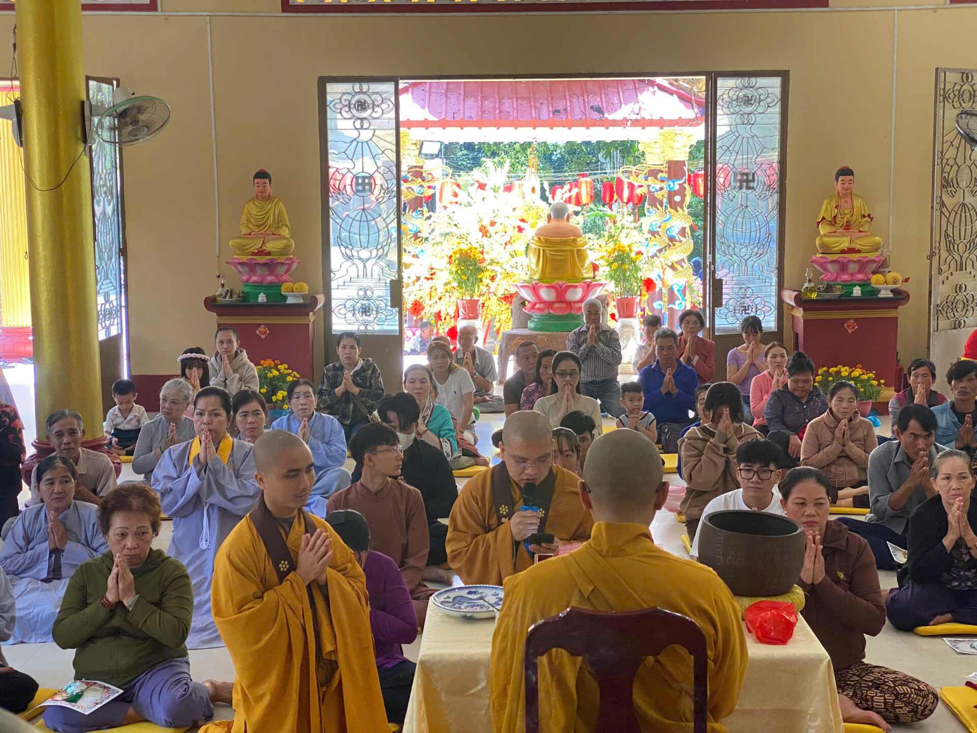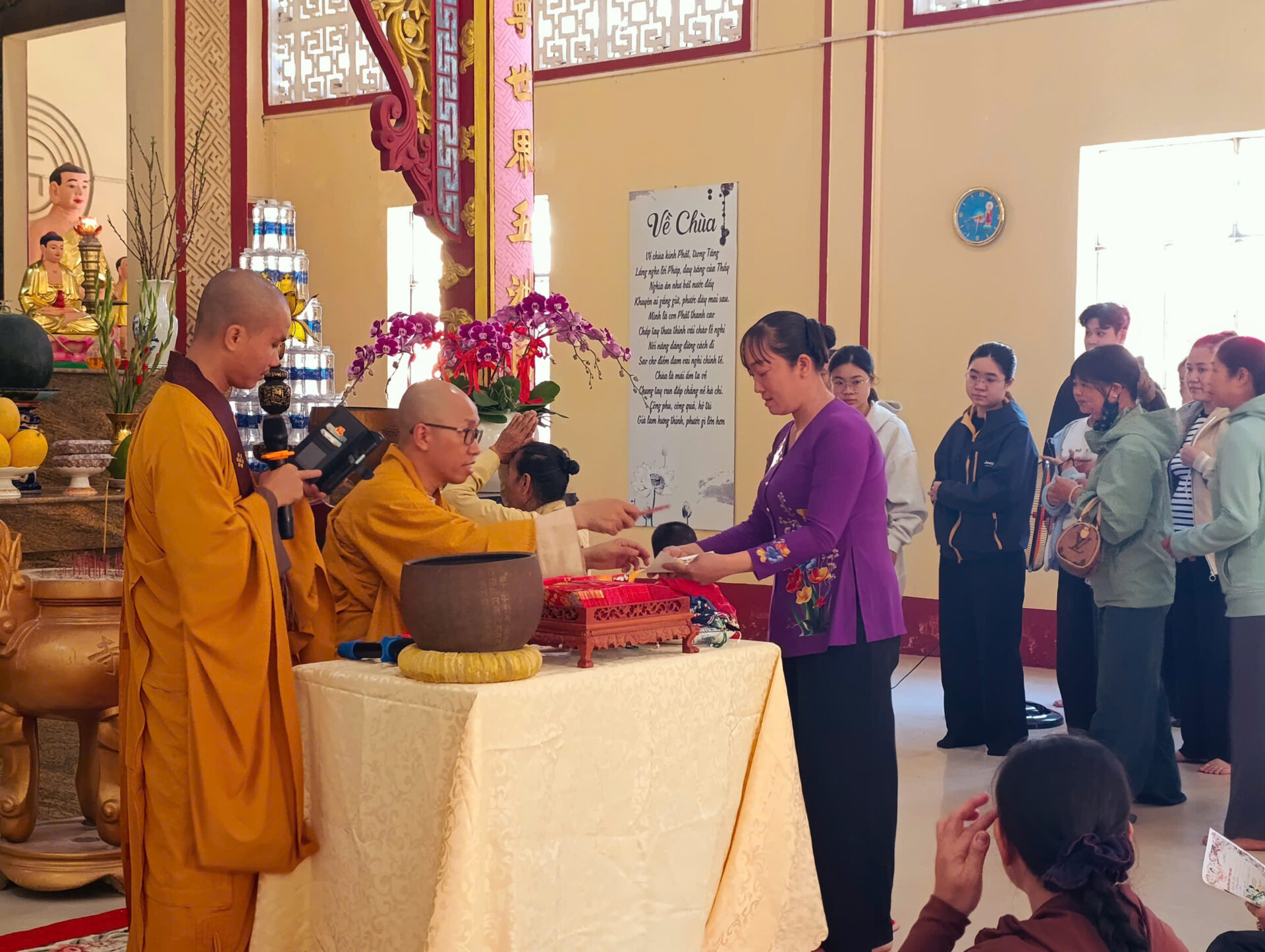 Bầu không khí đầu Xuân dường như vỡ òa trong niềm xúc động khi Sư phụ quang lâm bảo điện, ban bố nụ cười từ bi và những lời chúc Xuân ấm áp đến toàn thể đại chúng. Đặc biệt, ngay trong buổi sáng diệu kỳ này, một nhân duyên thù thắng đã hội đủ: hơn 20 thiện nam tín nữ đã phát bồ đề tâm, chính thức thọ nhận lễ Quy y Tam Bảo.