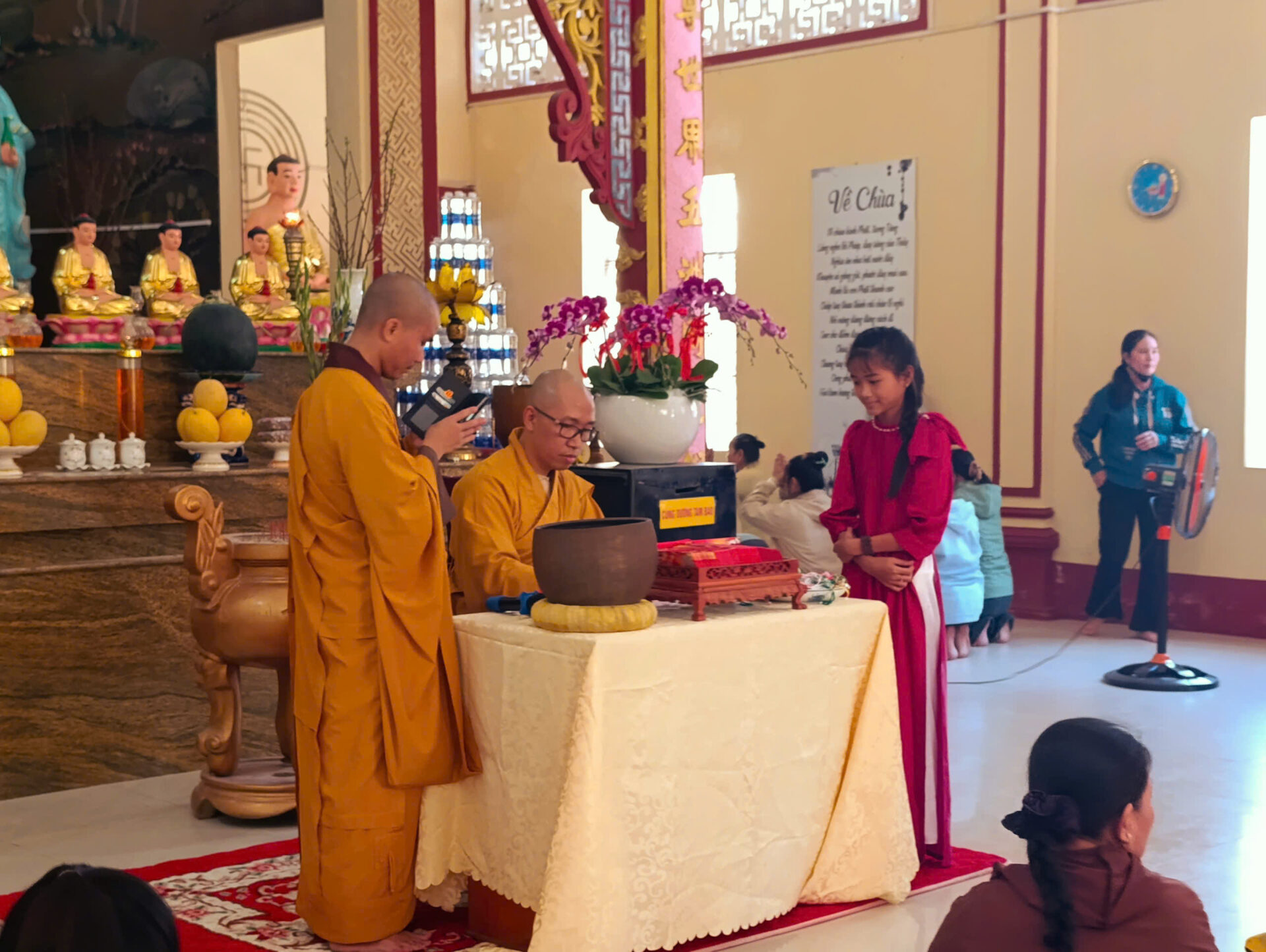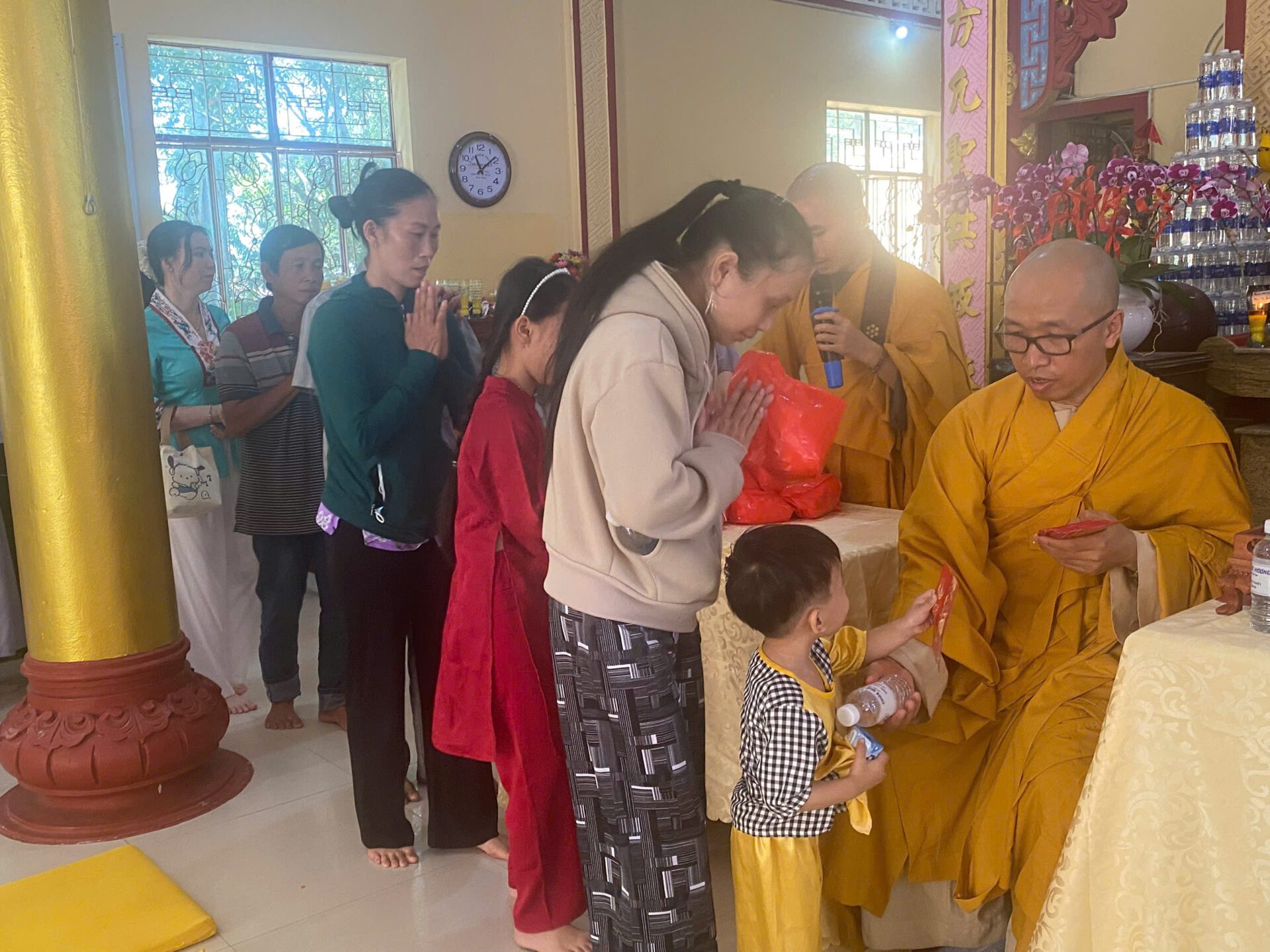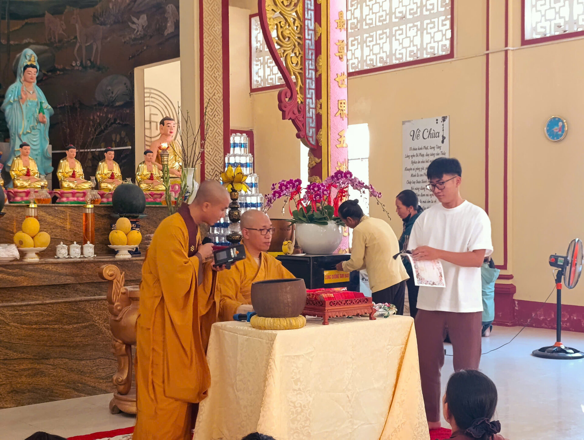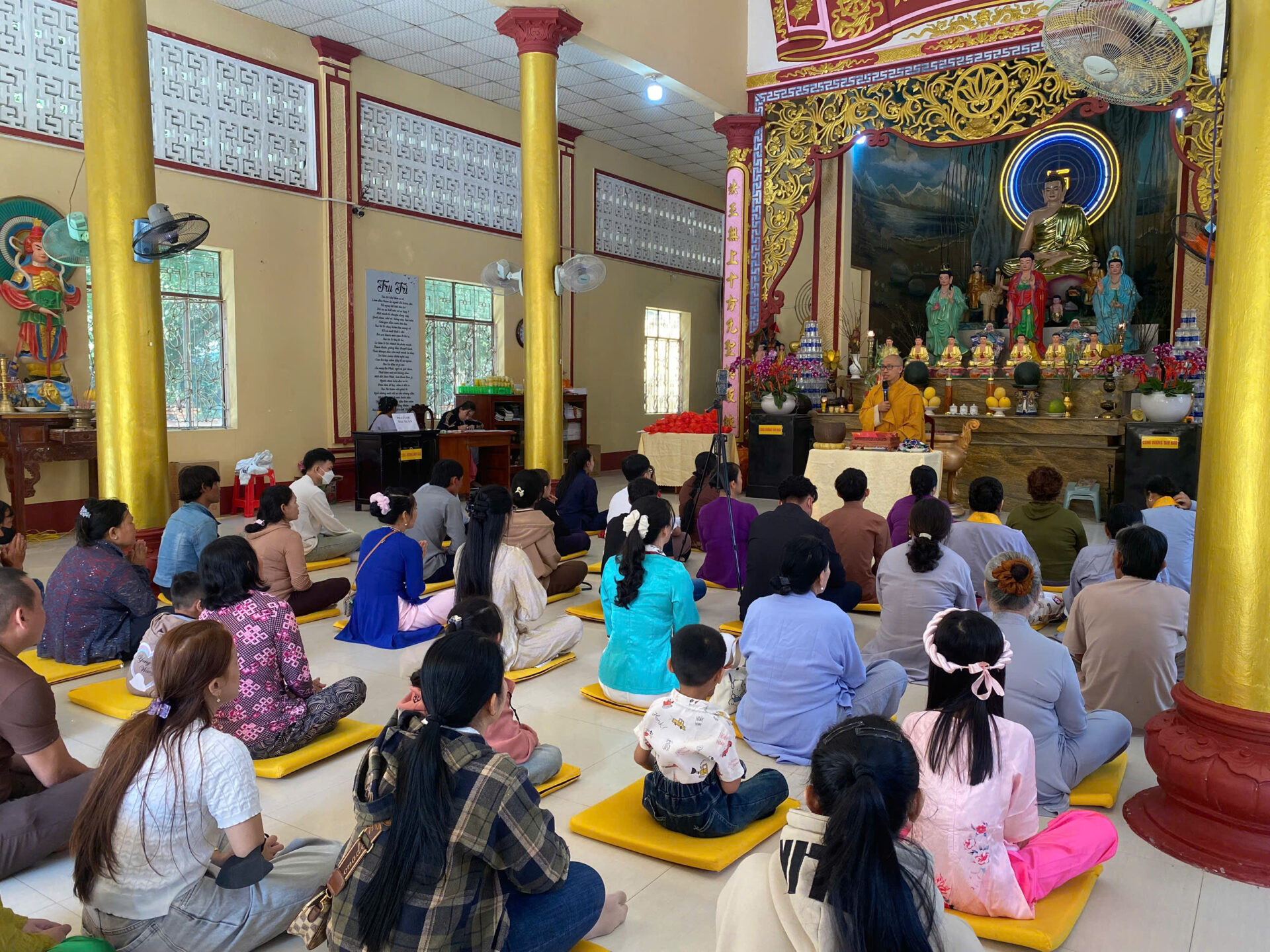 Bầu không khí đầu Xuân dường như vỡ òa trong niềm xúc động khi Sư phụ quang lâm bảo điện, ban bố nụ cười từ bi và những lời chúc Xuân ấm áp đến toàn thể đại chúng. Đặc biệt, ngay trong buổi sáng diệu kỳ này, một nhân duyên thù thắng đã hội đủ: hơn 20 thiện nam tín nữ đã phát bồ đề tâm, chính thức thọ nhận lễ Quy y Tam Bảo.
