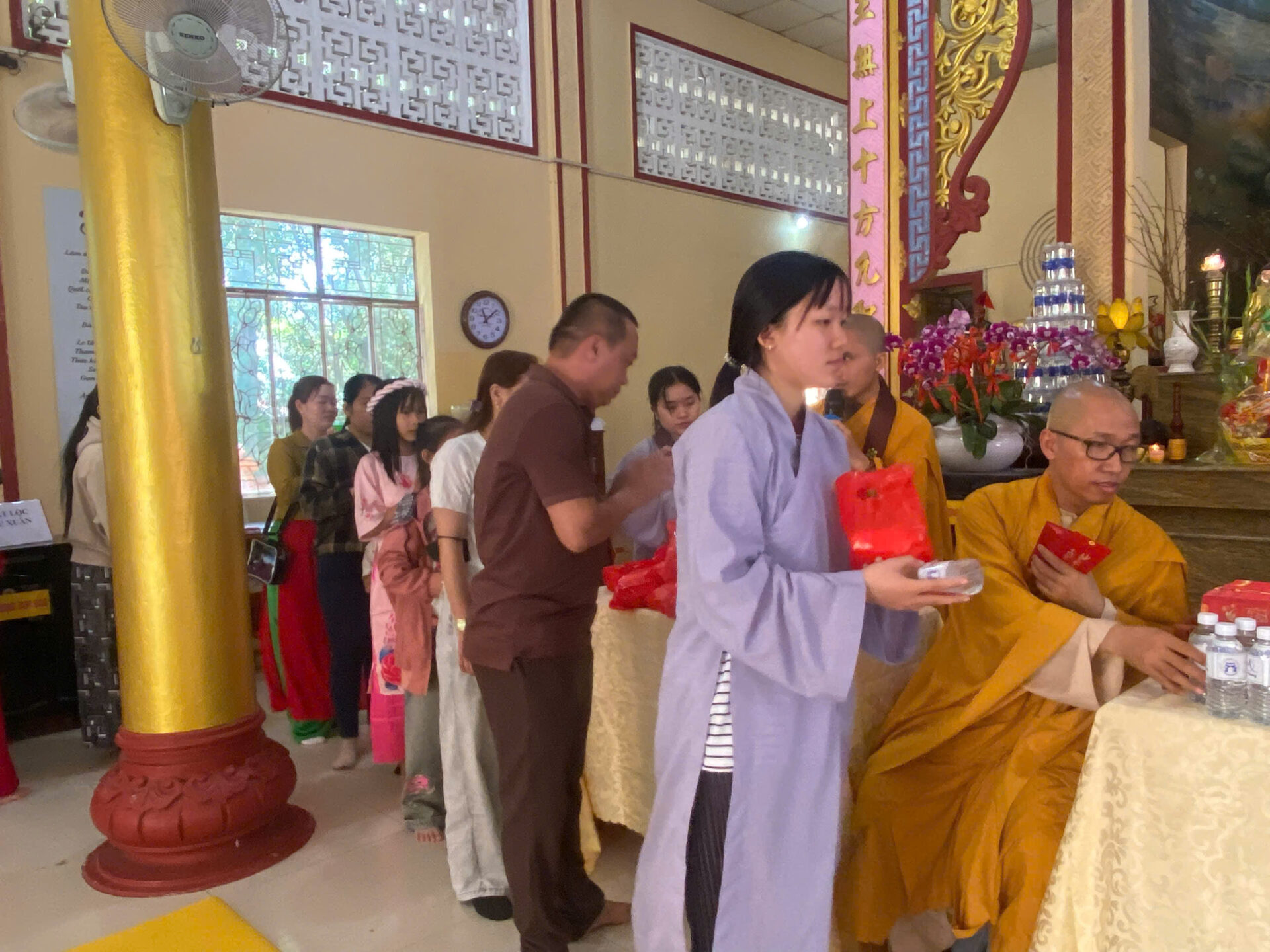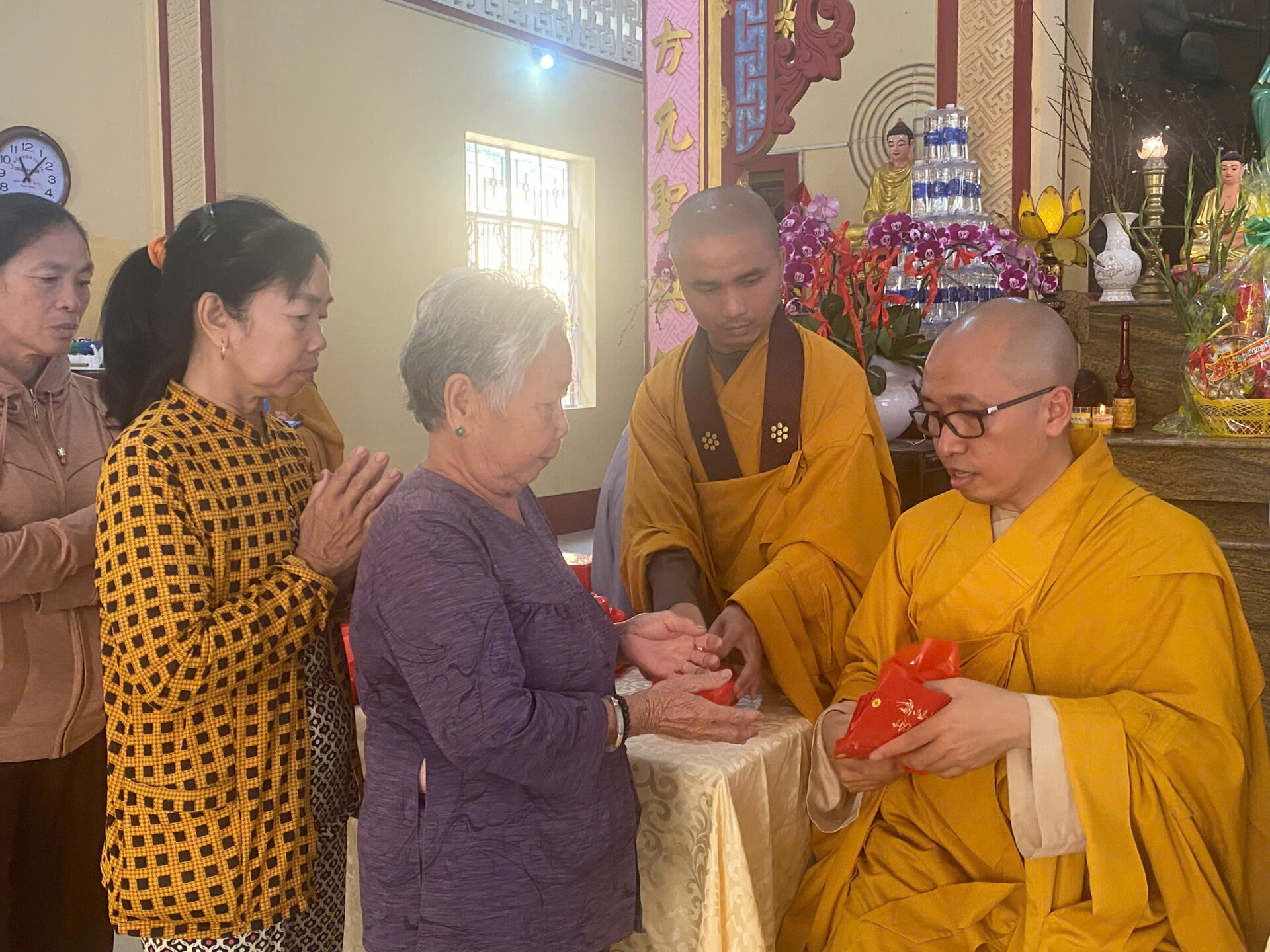Niềm vui đầu Xuân thêm phần viên mãn khi Sư phụ tự tay trao những phong bao lì xì đỏ thắm và những túi gạo lộc đến tận tay từng người. Bao lì xì chuyên chở lời chúc bình an, túi gạo lộc tượng trưng cho sự no ấm, sung túc và phước báu miên trường. Đây không đơn thuần là lộc vật chất, mà chính là nguồn năng lượng gia trì thiêng liêng từ mười phương Tam Bảo.